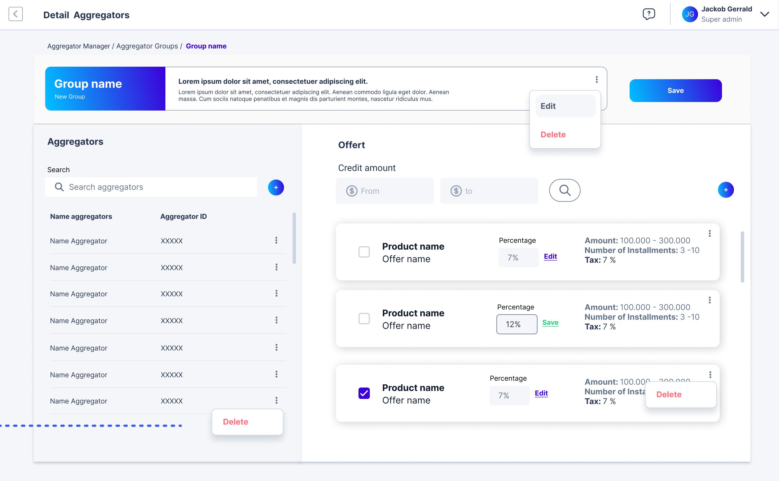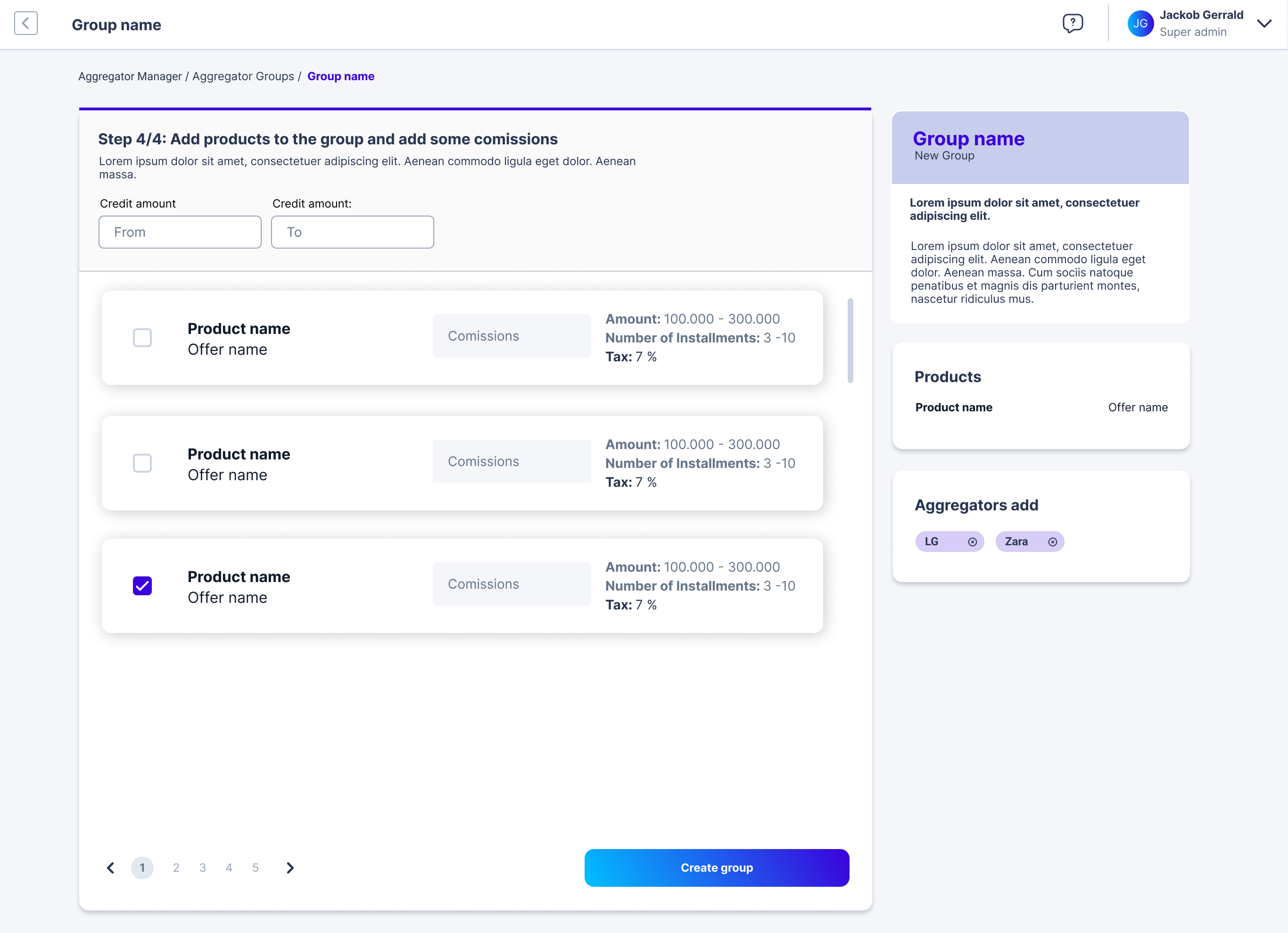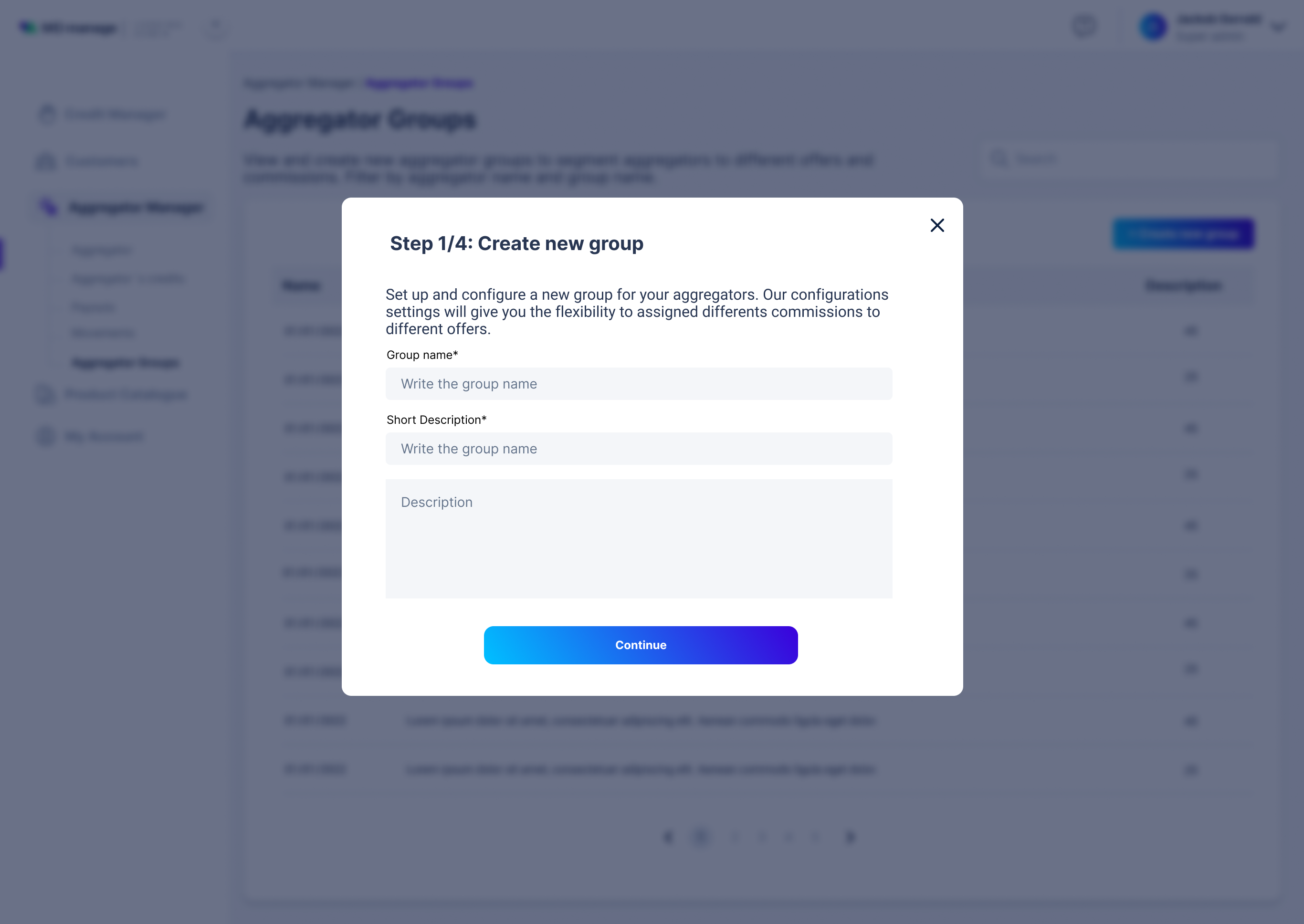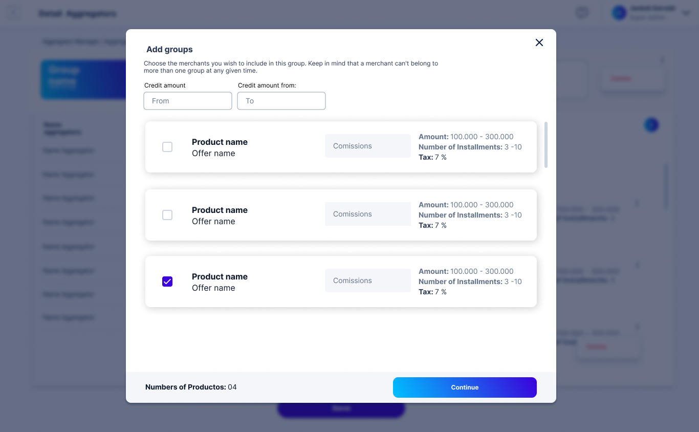 Once the Aggregators are selected, the Offers that will apply to the group must be selected. All previously configured offers will be displayed here. For each selected Offer, a commission must be associated to be charged to the Aggregator per credit issued.