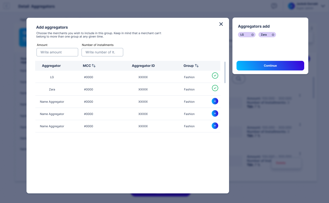 Select the Aggregators you wish to include in the new group. The continue button will activate when you have selected at least one merchant.