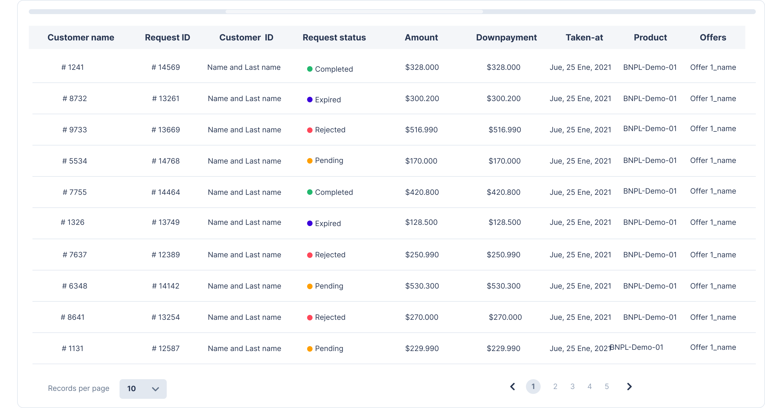 Request Status | Status of a pre-loan, the possible statuses are: completed, pending, rejected, or expired. |