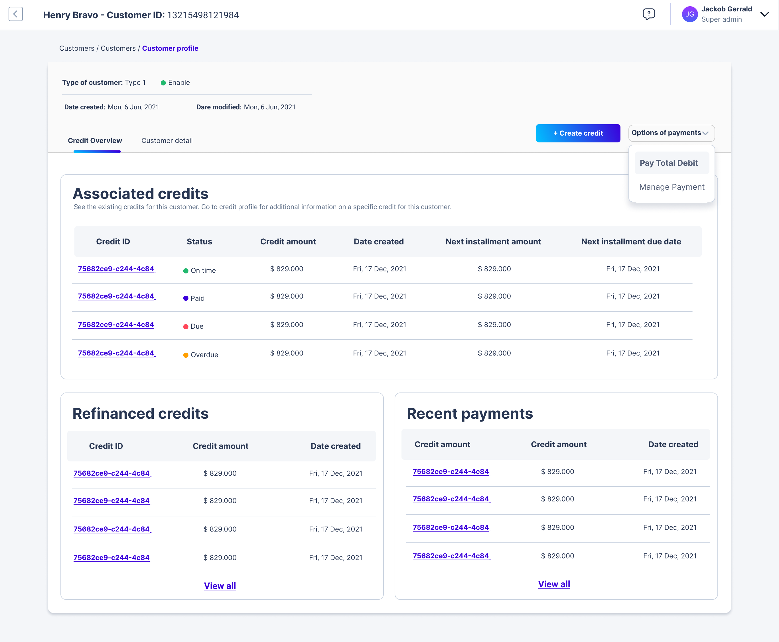 Every customer has a unique profile page that provides detailed information about them. On this page, you can view their credit overview, including details about their Associated credits, Refinanced credits, and Recent payments. Each item has a link that you can click to access further information.