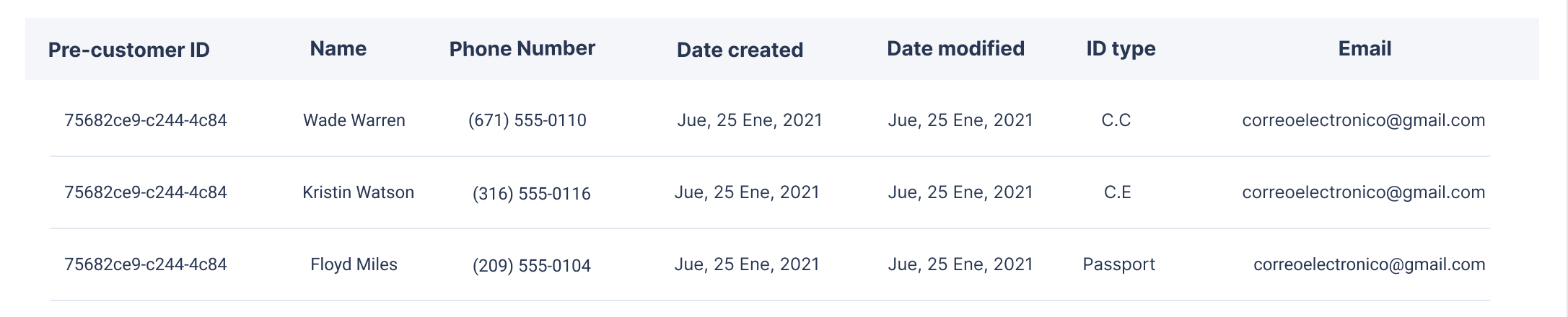 ID type | The type of identification document. E.g., Passport, C.C., C.E.. |
