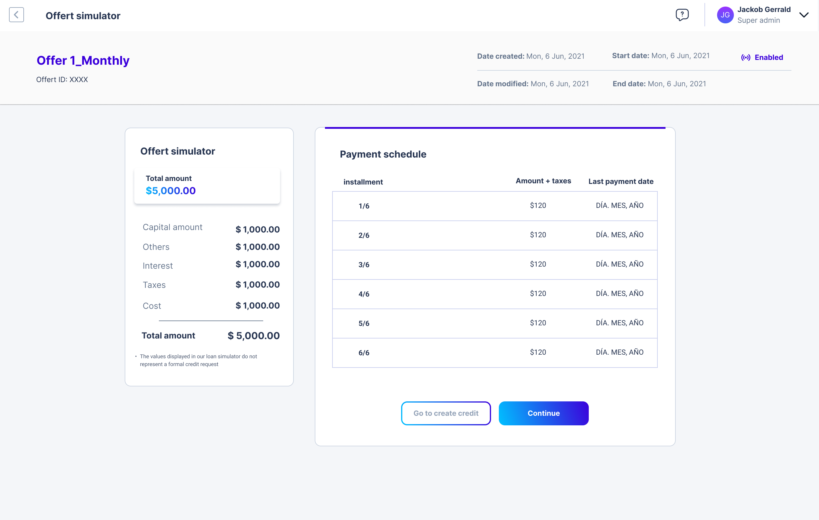 - Total amount: The total value of the simulated offer, containing the following values:
