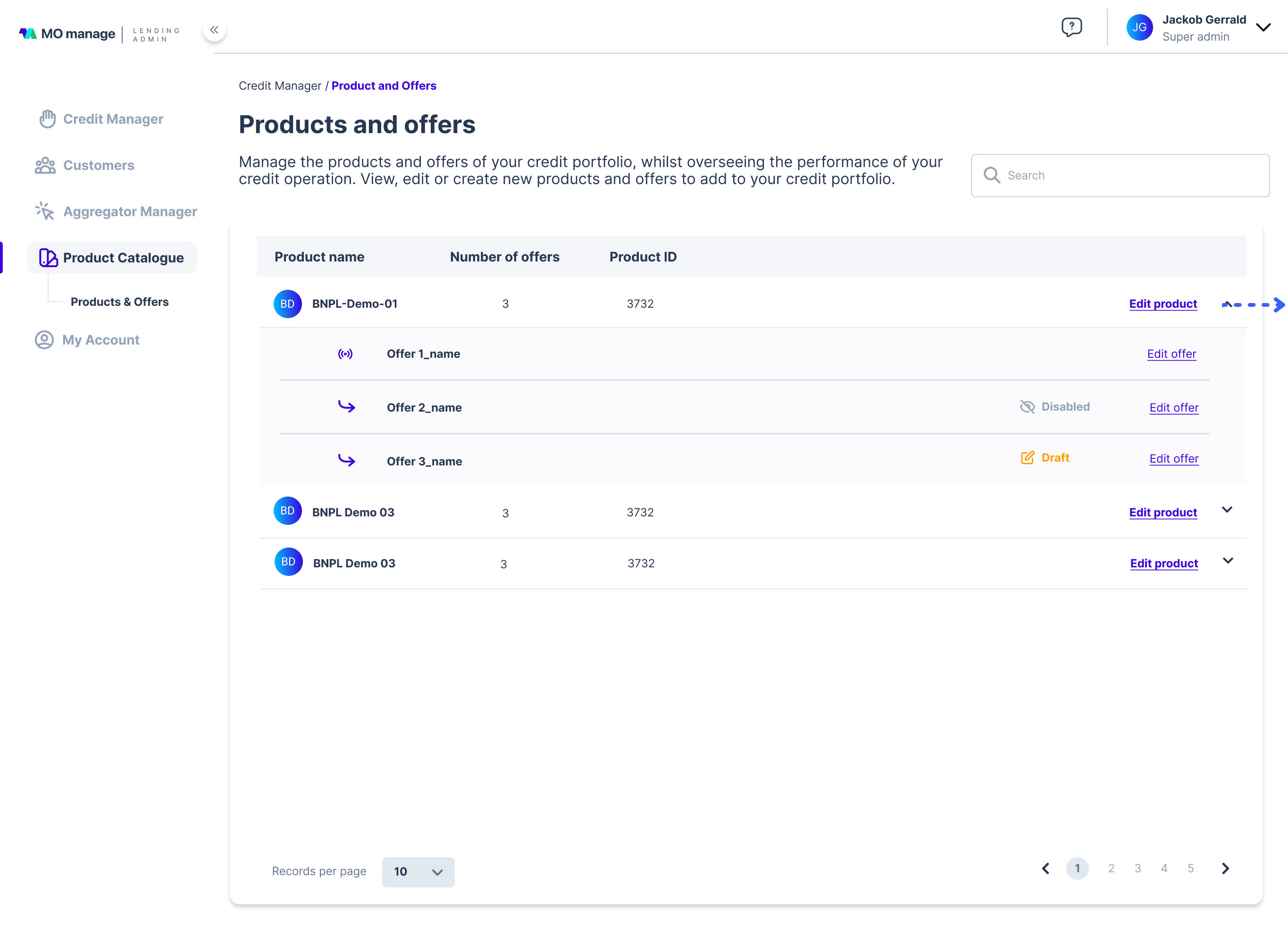 Each product can be expanded to show offers and edit them. Similarly, each offer can be accessed to see details and edited.